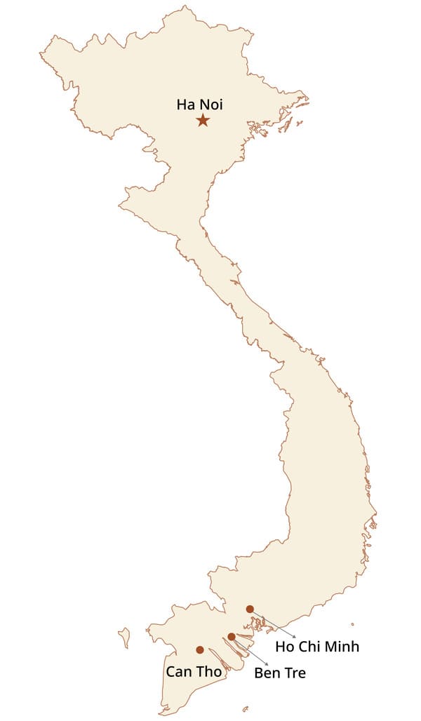 Ben Tre se présente comme un territoire rural fragmenté par une multitude de petits bras du Mékong. L’espace y est dominé par les cocoteraies, les vergers et les villages agricoles. Il n’existe pas de véritable centre urbain structurant. Le déplacement se fait lentement, au fil de l’eau ou à vélo, ce qui favorise une immersion directe dans la vie locale.