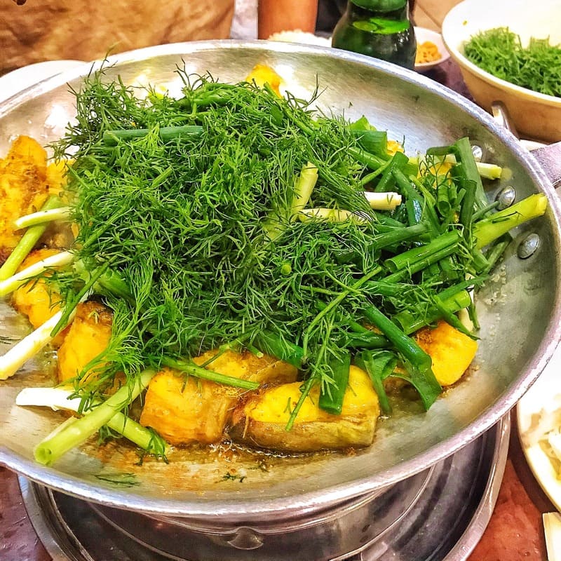 Manger du Chả Cá, c’est un spectacle. Le serveur pose sur la table une poêle en fonte brûlante où mijotent les morceaux de poisson grillé. Le feu crépite, l’aneth grésille, et l’air s’emplit d’un parfum envoûtant.