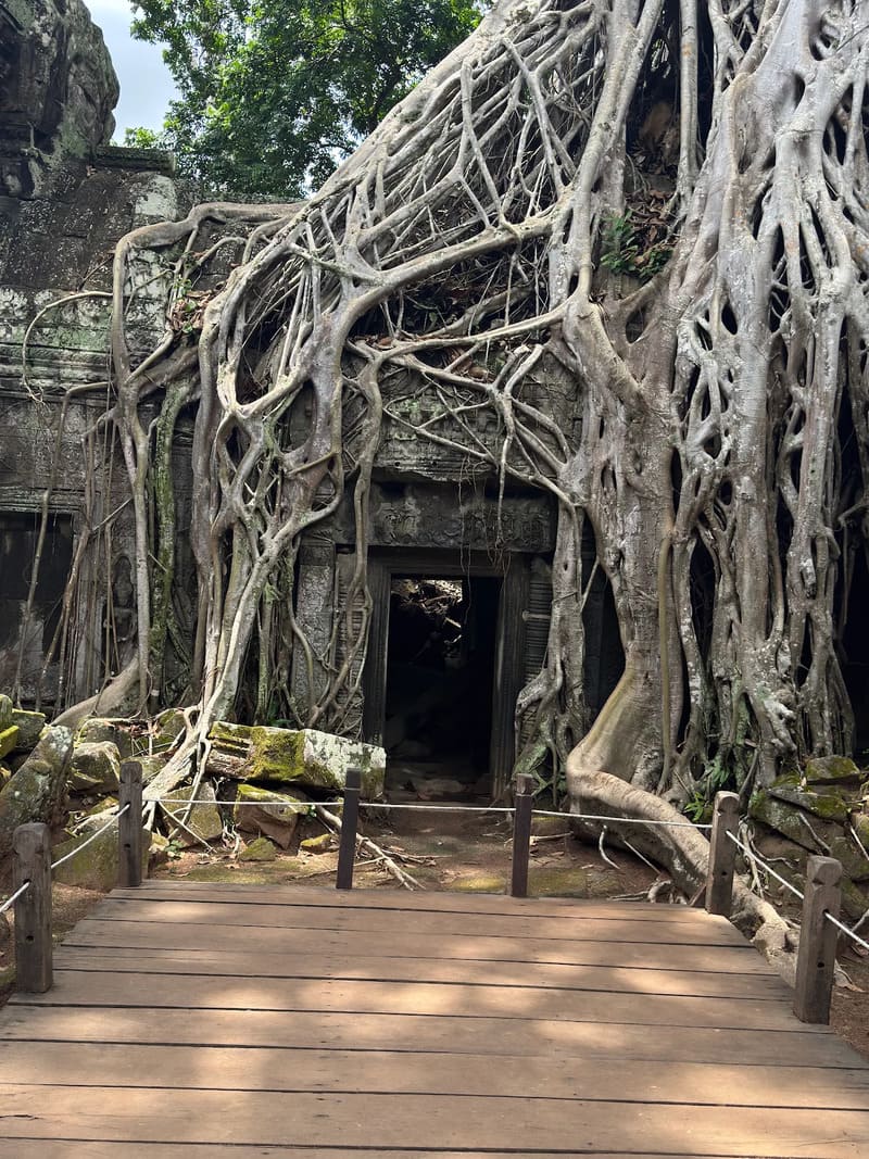 - Ta Prohm (le temple « Tomb Raider »), ouverture 7h30 - nous avons eu presque seuls des salles et racines géantes. Vers 8 h 40, les sentiers étaient déjà bondés. Nulle part ailleurs la nature ne « réengloutit » aussi puissamment les constructions : mousse, racines, portails effondrés mais encore debout.