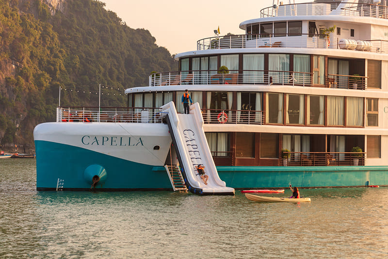 Capella Cruise : Le choix le plus moderne et le plus "fun" de la baie. Ce bateau est célèbre pour ses équipements dédiés aux loisirs : une piscine à débordement chauffée (permettant la baignade même en hiver), un toboggan gonflable géant qui se déploie dans la baie (un paradis pour les enfants et les adultes), et un mini-parcours de golf. Il propose même des suites duplex (sur 2 étages). Idéal pour les familles actives ou les groupes d'amis.