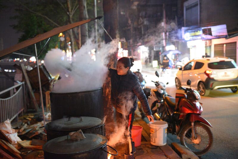 La vapeur monte des grandes marmites, quelques personnes surveillent le feu, discutent et rient ensemble. Ces moments reflètent ce que les Vietnamiens appellent “solidarité de quartier”, un esprit de convivialité et de partage de joie.