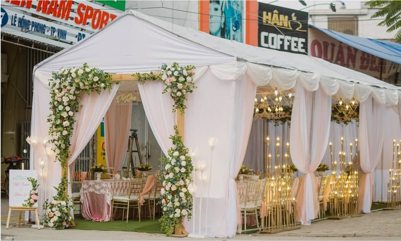 Parfois, un mariage peut même être célébré directement sur le trottoir : les tables et chaises sont serrées, la musique résonne, et tout se passe dans une atmosphère proche et chaleureuse, très typique de la vie vietnamienne.