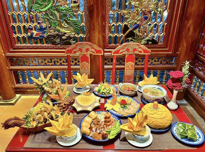 Pour assurer une ambiance typique, rappelant un passé prestigieux, les voyageurs sont d’abord invités à se déguiser en empereur ou en mandarin. Ils se réunissent ensuite autour d’une table sur laquelle sont proposés des mets autrefois réservés aux monarques vietnamiens. Durant toute la durée du repas, un groupe d’artistes joue un récital de chants et des morceaux de musiques traditionnels avec des instruments d'époque. Le dépaysement et la meilleure connaissance de la cour impériale sont assurés !