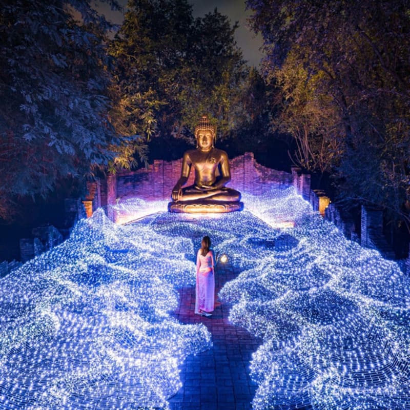Sous le thème « Lumière du Siam – Mère de la Nation », ce festival de lumière remplace les feux d’artifice par des spectacles de drones et des illuminations poétiques, en hommage à la Reine Sirikit.