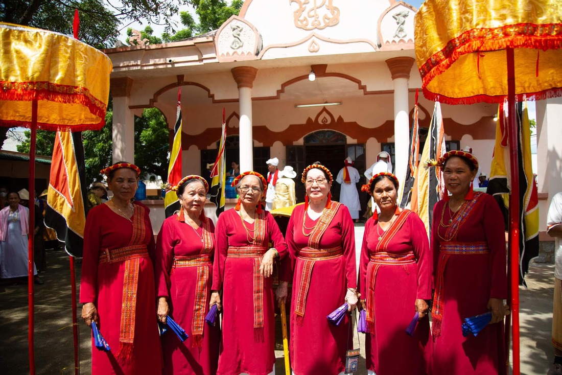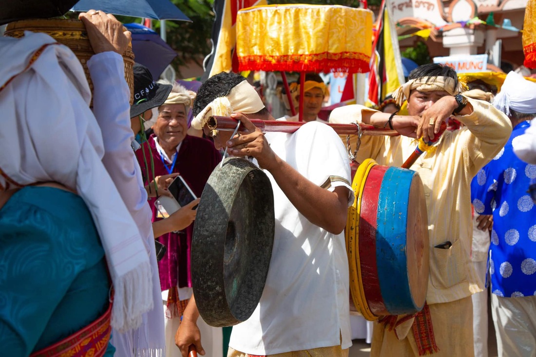 Pendant le festival, les Chams portent des costumes traditionnels éclatants. Les femmes s’habillent souvent en áo dài, portent des foulards et des coiffes décorées de motifs délicats.