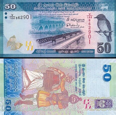 Billet de 50 devises : en bleu, mettent en avant le pont Manampitiya et présentent l'oiseau Moucherolle vert terne. Le verso présente un danseur Vadiga Patuna et la pierre protectrice Punkalasa.