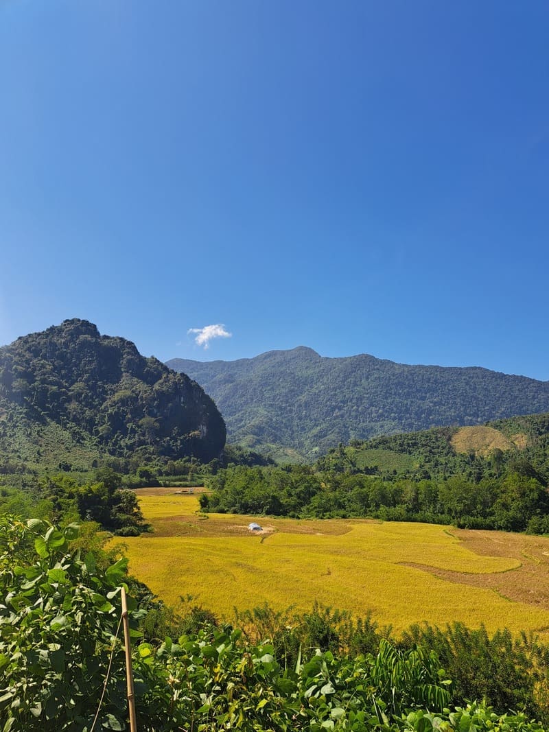 L'un des plus grands plaisirs à Muang Ngoi est de faire des randonnées vers les hameaux avoisinants, tels que Ba Na, Huay Bo ou Huay Sen. Le chemin principal débute à l'extrémité du village et se faufile à travers un paysage digne d'une carte postale : des rizières d'un vert intense, des buffles d'eau qui se vautrent dans la boue, et ces gigantesques structures karstiques qui servent constamment de toile de fond. C'est une opportunité rare d'observer la vie villageoise lao, simple et véritable. Prévoyez environ 1 à 2 heures de randonnée (aller-retour) pour arriver aux premiers villages. Ne manquez pas de faire une pause dans une petite boutique locale pour prendre un verre et partager un sourire.
