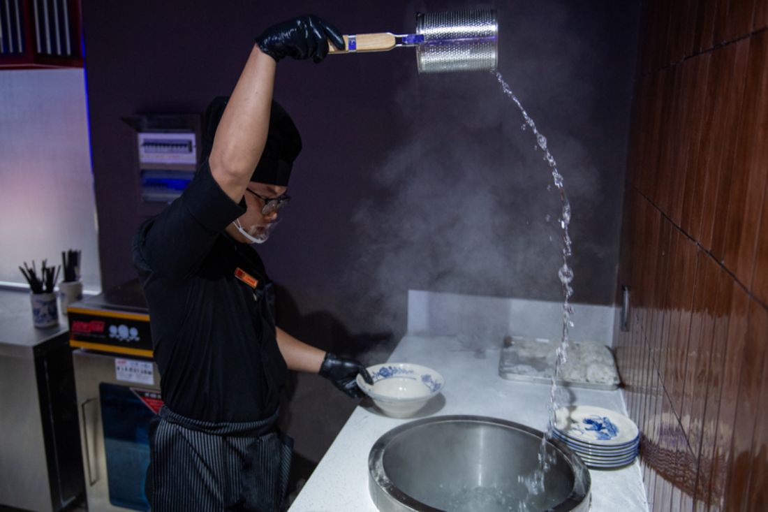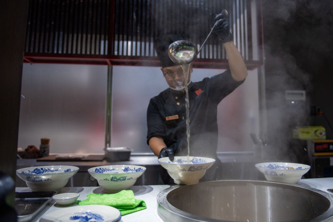 La cuisine du musée est conçue selon un modèle ouvert, permettant d’observer l’intégralité du processus de préparation, depuis le service du bouillon jusqu’à la présentation à table. Le personnel porte systématiquement des gants afin de garantir une hygiène et une sécurité alimentaires optimales.