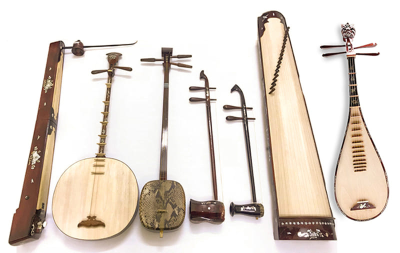 - Đàn nhị : Instrument à deux cordes frottées, dont le corps en bois est recouvert de peau de serpent ou de python. Son archet est fabriqué en bois ou en bambou, garni de crin de cheval. Sans frettes, le manche offre une grande liberté d’interprétation. L’exécution demande une grande virtuosité avec des techniques comme le vibrato, le legato, le staccato, les trilles ou encore les glissandi.