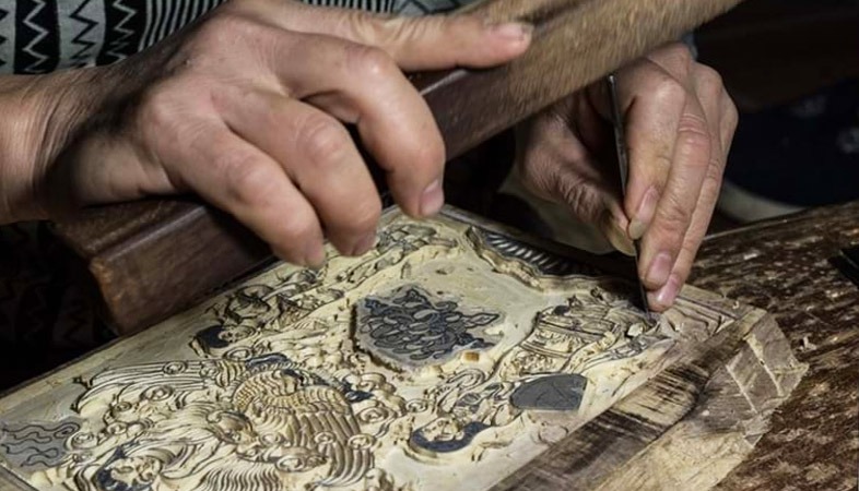 À cette étape, l'artiste conçoit et dessine soigneusement la peinture, en prêtant attention à chaque détail. Pour sculpter la planche de bois, ils utilisent des outils appelés "ve" (ciseaux), fabriqués en acier dur. Chaque jeu de "ve" contient environ 30 à 40 pièces différentes, chacune ayant un but unique pour donner vie à l'œuvre d'art.