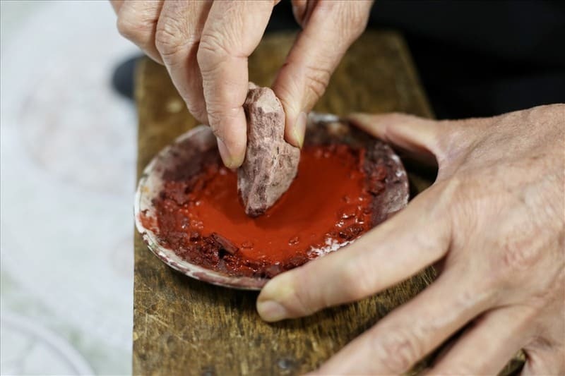 - Rouge : à partir de bois de sappan ou de galet rouge, souvent représenté dans des teintes brun-rougeâtre.