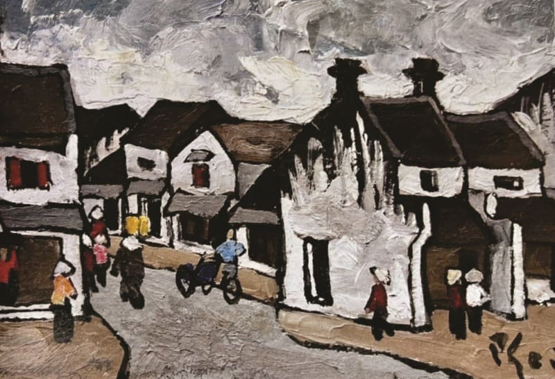 Amoureux éternel du Vieux Quartier de Hanoï, il a passé sa vie à peindre ses vieilles rues, ses toits de tuiles moussus et ses murs décrépis avec des contours noirs marqués et une palette de couleurs sobres.