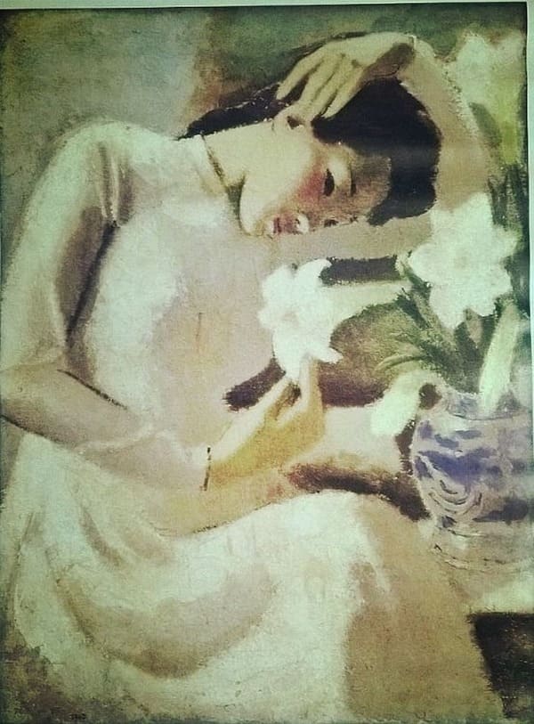 L'œuvre iconique : "Thiếu nữ bên hoa huệ" (Jeune femme aux lys, 1943). C'est sans doute le tableau le plus célèbre du Vietnam, représentant une jeune fille en áo dài blanc inclinant la tête vers un vase de lys, capturant l'essence de la beauté féminine vietnamienne.