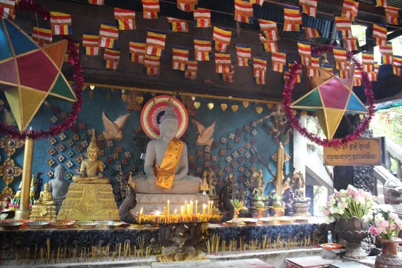 - Preah Ang Thom : ce temple abrite un immense Bouddha couché, sculpté dans un bloc de grès selon les formes naturelles de la montagne, mesurant environ 8 mètres de long et 3 mètres de haut. C’est un lieu de pèlerinage important pour les bouddhistes. Même après que le bouddhisme Mahayana a supplanté l’hindouisme comme religion dominante au XIIᵉ siècle, Phnom Kulen est resté un site spirituel majeur.
