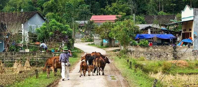 - La balade bucolique des villages (1h30 à 2h, niveau facile) : Cet itinéraire quasi plat est une invitation à la contemplation. Il relie les petits hameaux de Nà Chang et Lũng Điêng en suivant les rives paisibles de la rivière Quây Sơn. C'est l'occasion d'observer la vie locale de très près : des enfants se baignant dans la rivière, des femmes lavant le linge, et des anciens travaillant la terre autour de leurs maisons sur pilotis. Une sérénité absolue.