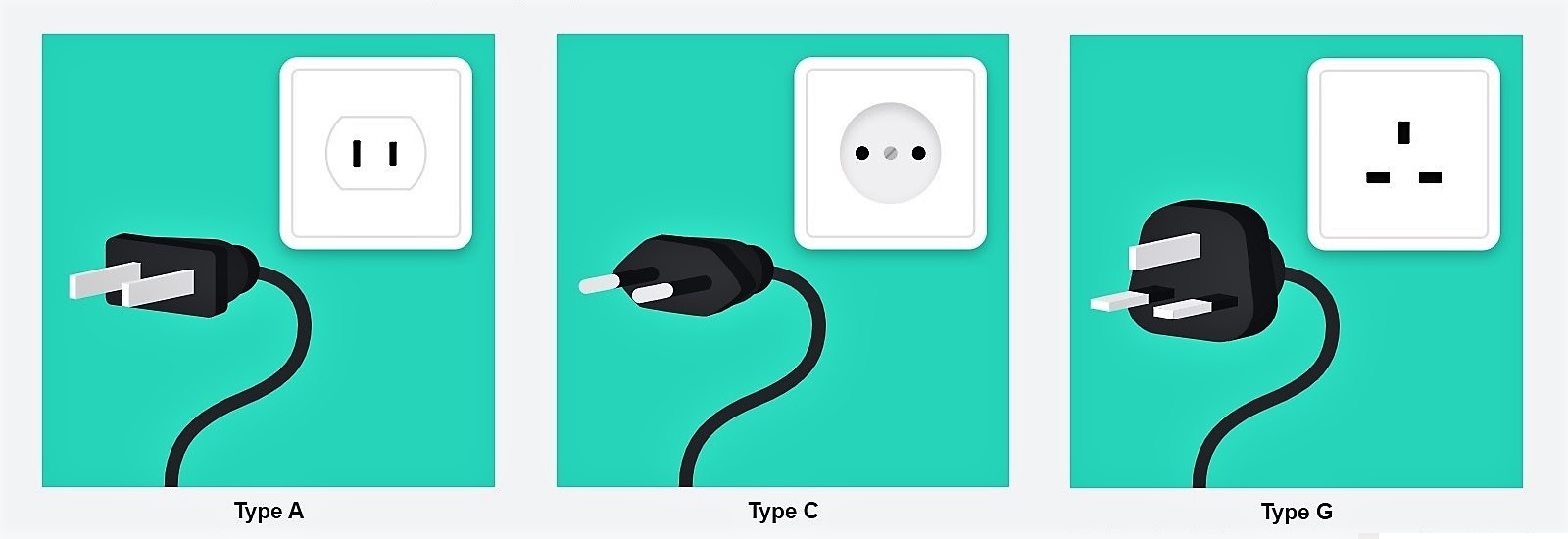 - Type G : Prise à 3 broches rectangulaires, de type britannique, généralement trouvée dans les hôtels haut de gamme.