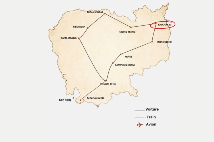Ratanakiri, situé à l'extrême nord-est du Cambodge, partage ses frontières avec le Vietnam et le Laos, révélant son attrait au cœur de la région d'Indochine. Cette province est à une distance d'environ 600 kilomètres de la capitale Phnom Penh.