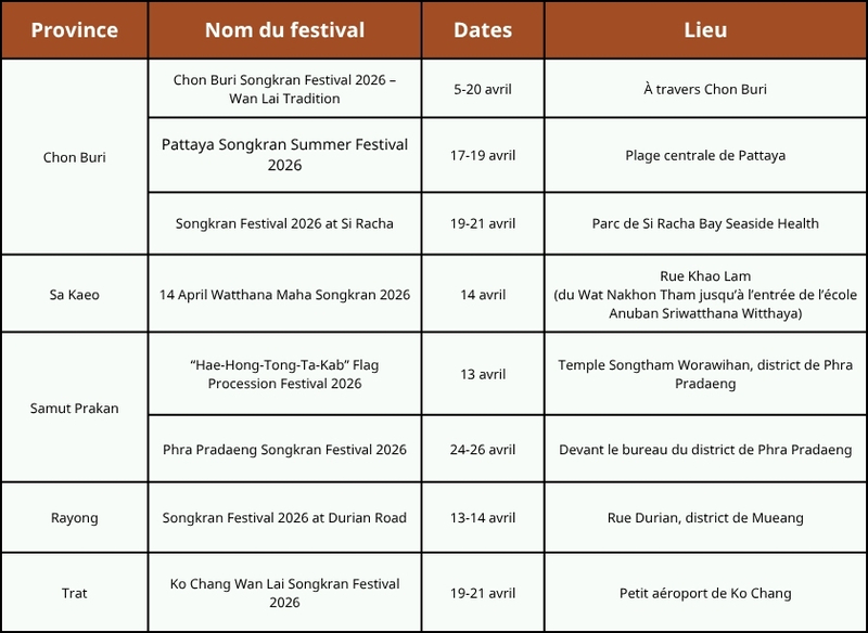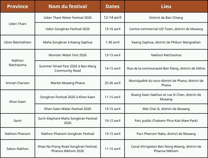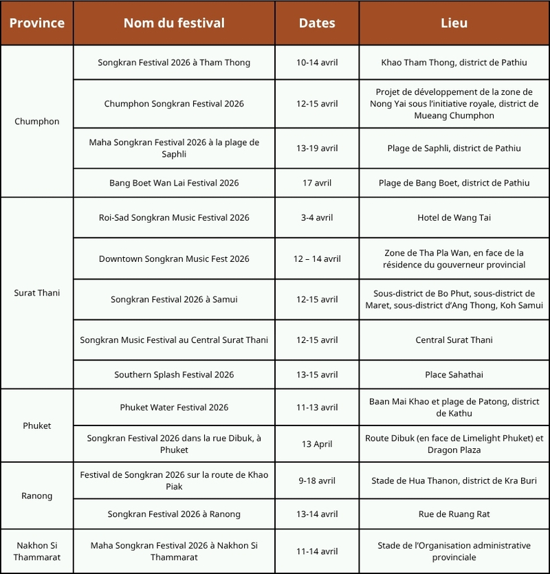 Au-delà de la capitale, chaque région offre une expérience unique : le Centre de la Thaïlande propose le célèbre lancer d’eau avec les éléphants à Ayutthaya, tandis que le Nord (Chiang Mai, Nan) préserve des rituels culturels anciens. Vous pourrez ressentir l’ambiance urbaine moderne dans le Nord-Est, profiter des fêtes en bord de mer dans le Sud (Phuket, Samui), ou prolonger le plaisir à Chonburi avec leur tradition unique du « Wan Lai ».