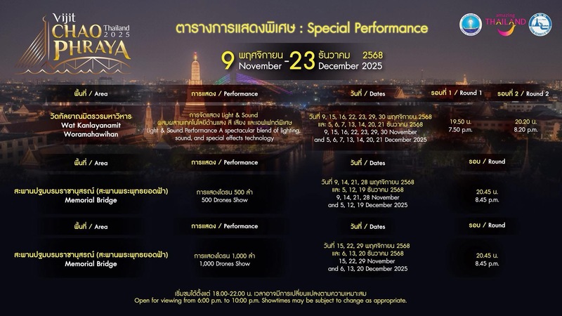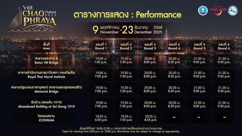Veuillez suivre les actualités sur la page Facebook officielle Vijit Chao Phraya 2025 ou sur le site www.thailandfestival.org pour tous les détails.